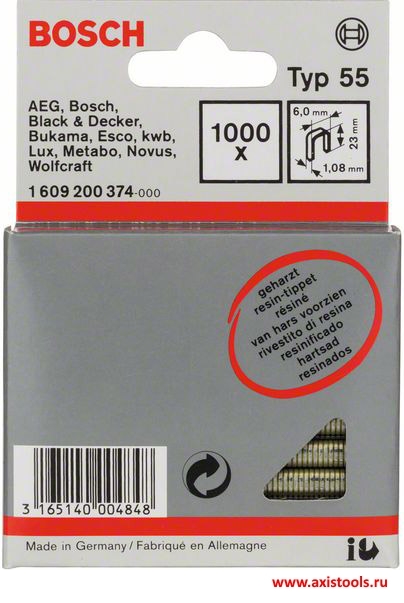Скобы с узкой перекладиной T55 1609200374 идеально подходят для использования со строительными степлерами следующих марок: AEG, Bosch, Black+Decker, Bukama, Esco, kwb, Lux, Metabo, Novus, Wolfcraft