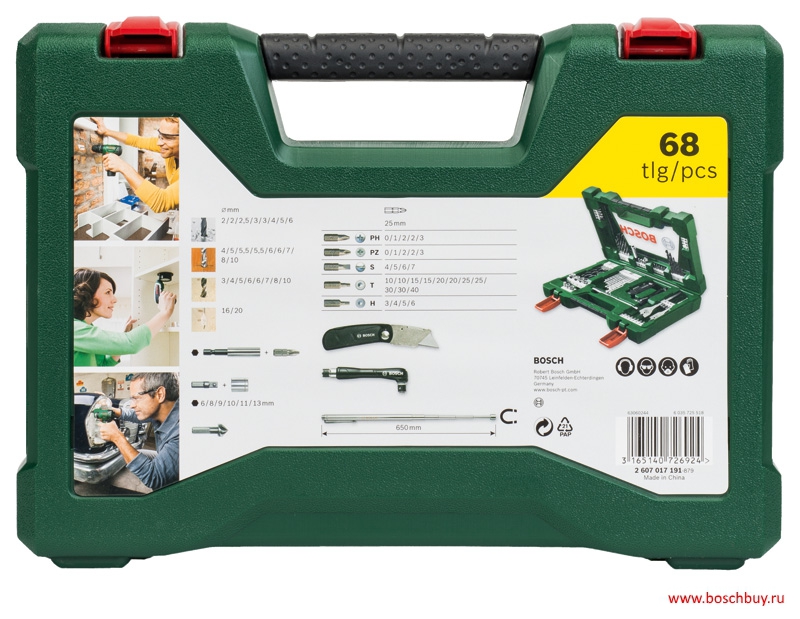Содержание 1 складной нож 1 магнитный захват 1 угловой шуруповерт 8 сверл по металлу HSS-R Ø 2-6 мм 9 сверл по камню Ø 4-10 мм 8 сверл по древесине Ø 3-10 мм 2 плоскофрезерных сверла Ø 16/20 мм 29 насадок-бит, L = 25 мм PH 0/1/2/2/3 PZ 0/1/2/2/3 S4/5/6/7 T10/10/15/15/20/20/25/25/30/30/40 H3/4/5/6 6 торцовых ключей Ø 6/8/9/10/11/13 мм 1 универс. держатель, магнитный 1 зенкер Комплектация Bosch 2607017191, 2 607 017 191, 2.607.017.191