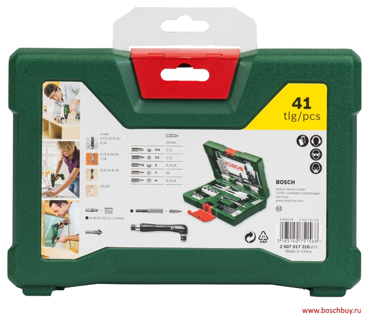 Содержание 1 угловой шуруповерт 7 сверл по металлу HSS-R Ø 2-6 мм 6 сверл по камню Ø 5-8 мм 5 сверл по древесине Ø 3-8 мм 2 плоскофрезерных сверла Ø 16/20 мм 11 насадок-бит, L = 25 мм PH 1/2 PZ 1/2 S 4/5/6 T 20 H 4/5/6 6 торцевых ключей Ø 6/8/9/10/11/13 мм 1 универс. держатель, магнитный 1 зенкер