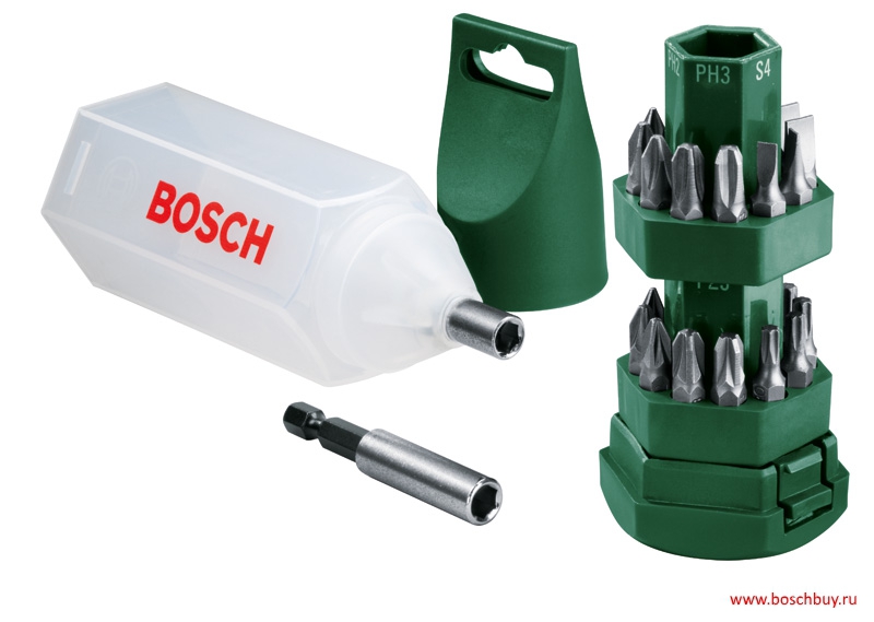 Описание Bosch 2607019503, 2 607 019 503, 2.607.019.503 Набор из 24 бит (SL, PH, PZ, T) и магнитный держатель. C 2011 года отпускается только по 2 набора.