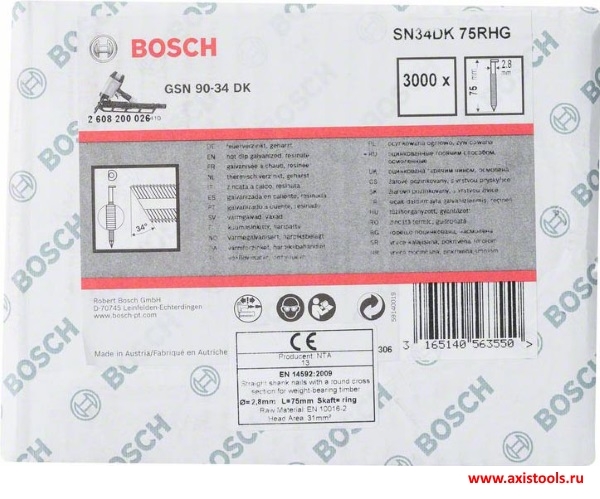 Гвозди 2608200026 с D-образной головкой в обойме, рифленые, оцинкованные, размещенные под углом 34 градуса предназначены для работы с пневматическим гвоздезабивателем Bosch при работе в помещении