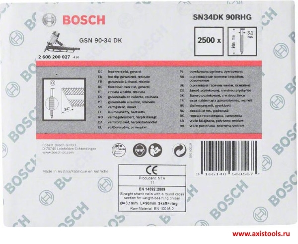 Гвозди 2608200027 с D-образной головкой в обойме, рифленые, оцинкованные, размещенные под углом 34 градуса предназначены для работы с пневматическим гвоздезабивателем Bosch при работе в помещении