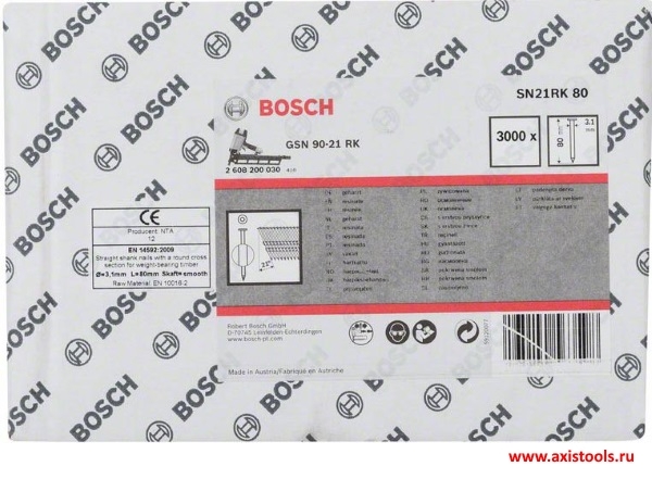Гвозди с круглой головкой 2608200030 в обойме под углом 21 градус, предназначены для работы с пневматическим гвоздезабивателем Bosch в помещении