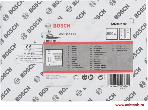 Гвозди с круглой головкой 2608200031 в обойме под углом 21 градус, предназначены для работы с пневматическим гвоздезабивателем Bosch в помещении