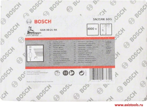Гвозди с круглой головкой 2608200032 в обойме под углом 21 градус, оцинкованные, предназначены для работы с пневматическим гвоздезабивателем Bosch в помещении
