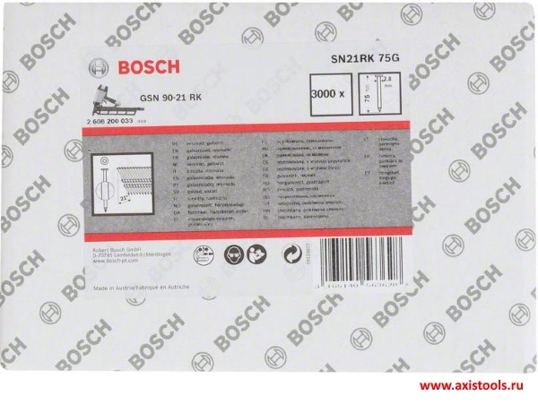 Гвозди с круглой головкой 2608200033 в обойме под углом 21 градус, оцинкованные, предназначены для работы с пневматическим гвоздезабивателем Bosch в помещении