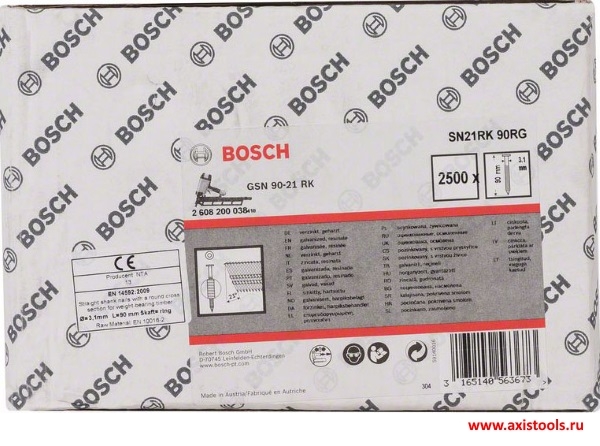 Гвозди с круглой головкой 2608200038 в обойме под углом 21 градус, оцинкованные, рифленые, предназначены для работы с пневматическим гвоздезабивателем Bosch в помещении