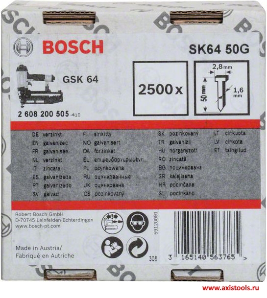 Штифты с потайной головкой 2608200505 идеально подходят для пневматического гвоздезабивателя Bosch GSK 64 Professional