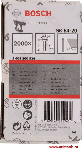 Штифты с потайной головкой 2608200536 идеально подходят для пневматического гвоздезабивателя Bosch GSK 18 V-Li Professional
