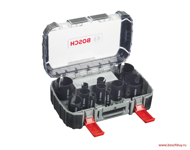 11 коронок, 1 переходник Power Change, по 1 центрирующему сверлу HSS/TCT и плоскофрезерному сверлу