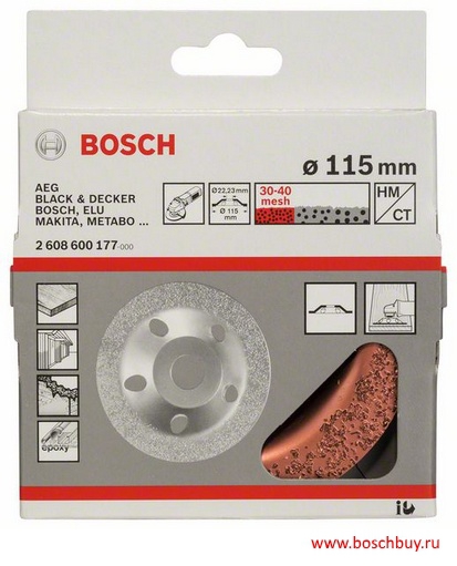 Широкая сфера применения: затирка шероховатостей декоративного бетона после oпалубки, удаление остатков бетона с опалубочных досок, очистка небольших участков защитного покрытия, обработка закруглений и углов на мраморе, подгонка поверхностей газобетона, обработка силикатного кирпича, выравнивание и удаление остатков клея перед укладкой керамической плитки, обработка копыт (овец, коз, рогатого скота). Обрабатываемые материалы: стеклопластик (GFK), мягкая и твердая древесина, краски/лаки, газобетон, полимеры, заполнители, резина, пробка, кожа, песчаник, силикатный кирпич. Для угловых шлифмашин с угловой скоростью не более 80 м/с (в зависимости от частоты вращения и Ø круга). Примечание: для удаления пыли рекомендуется использовать вытяжной кожух Bosch 2 605 510 107 (на угловые шлифмашины Bosch устанавливается без использования инструмента).