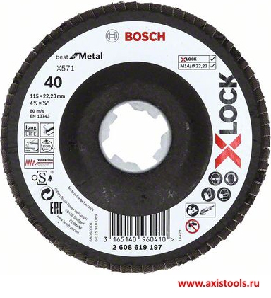 - Лепестковый шлифовальный круг X-LOCK X571 Best for Metal 2608619197 предназначен для углошлифовальных машин с системой крепления X-LOCK и болгарок с обычной системой крепления