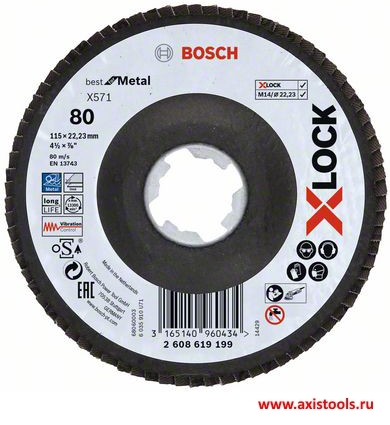 - Лепестковый шлифовальный круг X-LOCK X571 Best for Metal 2608619199 предназначен для углошлифовальных машин с системой крепления X-LOCK и болгарок с обычной системой крепления