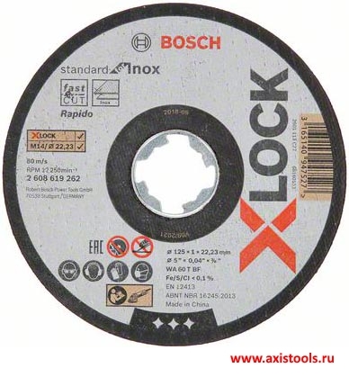 - Отрезной круг X-LOCK Standard for Inox 2608619267 предназначен для углошлифовальных машин с системой X-LOCK и болгарок с обычной системой крепления