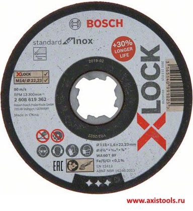 - Отрезной круг X-LOCK Standard for Inox 2608619362 предназначен для углошлифовальных машин с системой X-LOCK и болгарок с обычной системой крепления