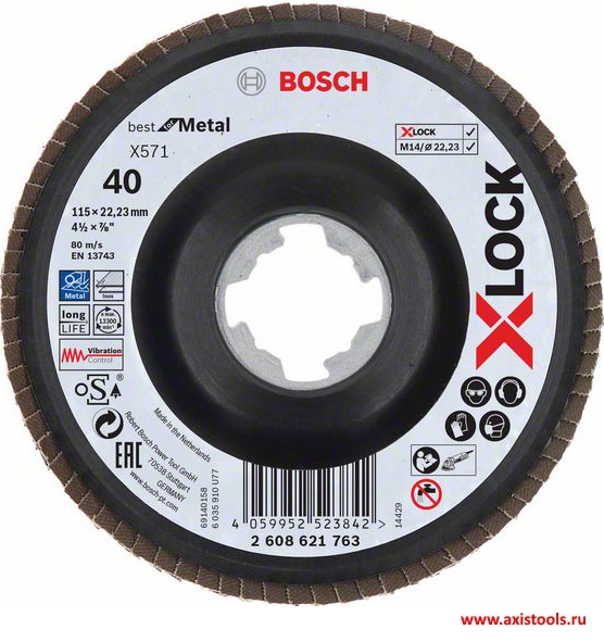 - Лепестковый шлифовальный круг X-LOCK X571 Best for Metal 2608621763 предназначен для углошлифовальных машин с системой крепления X-LOCK и болгарок с обычной системой крепления