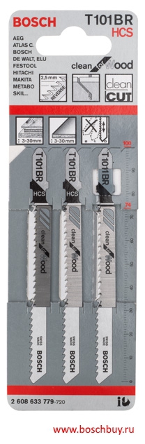 Пилка для лобзика Clean for Wood, T 101 BR, набор 3 пилки по дереву с обратным зубом (2 608 633 779, 2608633779, 2.608.633.779)