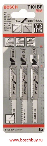 Пилка для лобзика Clean for Hard Wood, T 101 BF, набор 3 пилки по твердому дереву (2 608 636 226, 2608636226, 2.608.636.226)