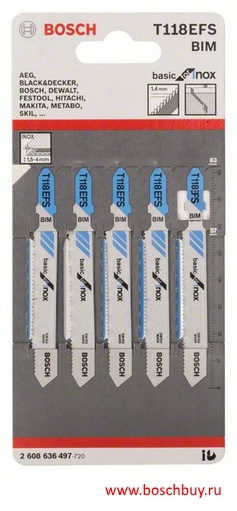 Комплект 5 пилок Bosch Basic for Inox T 118 EFS для лобзика (2 608 636 497, 2608636497, 2.608.636.497)
