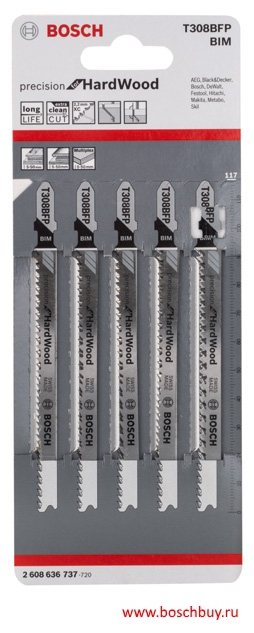 Пилка для лобзика Precision for Hard Wood, T 308 BFP, набор 5 пилок по твердому дереву (2 608 636 737, 2608636737, 2.608.636.737)