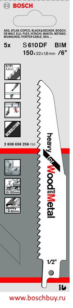 2608656256 Комплект 5 пилок Heavy for Wood and Metal S 610 DF BIM для ножовки по дереву и металлу