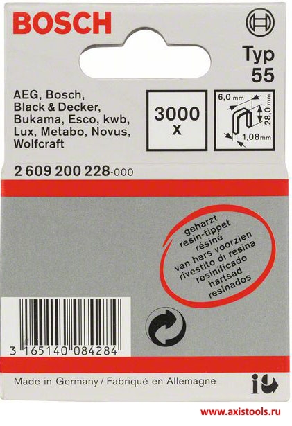 Скобы T55 2609200228 идеально подходят для использования со строительными степлерами следующих марок: AEG, Bosch, Black+Decker, Bukama, Esco, kwb, Lux, Metabo, Novus, Wolfcraft