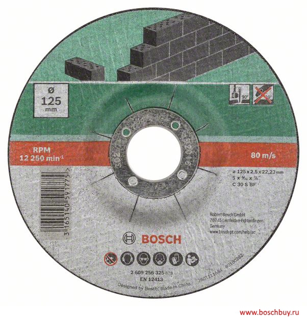 Характеристики Bosch 2609256335, 2 609 256 335, 2.609.256.335 Спецификация C 30 S BF Диаметр, мм 125 Диаметр отверстия, мм 22,23 Толщина, мм 2,5 обрабатываемые материалы Камень Бетон