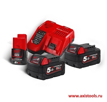 Набор Milwaukee M18 NRG-502 4933459217 включает в себя 2 аккумулятора M18 B5 на 5 Ач, один аккумулятор M12 B2 на 2 Ач и зарядное устройство M12-18 FC, которые предназначены для аккумуляторов Milwaukee M18 и M12
