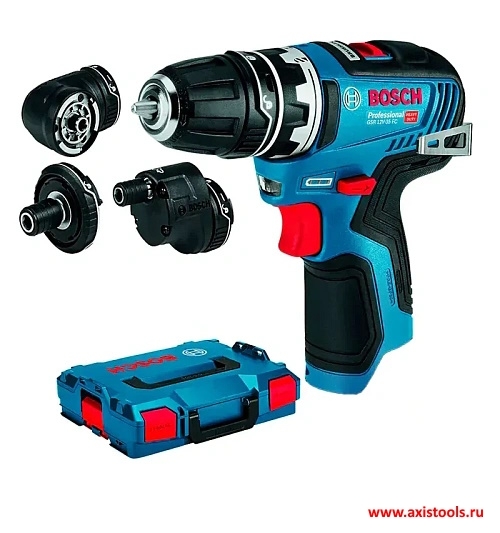 GSR 12V-35 FC обладает системой FLEXCLICK и позволяет превратиться из шуруповерта в дрель-шуруповерт и в угловую дрель-шуруповерт используя сменные насадки.