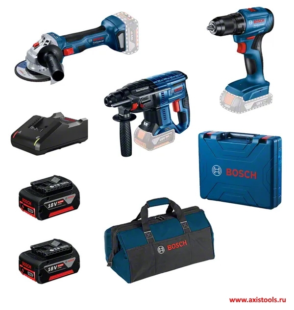В состав набора входят три основных инструмента: аккумуляторная дрель-шуруповёрт Bosch GSR 185-LI, аккумуляторный перфоратор Bosch GBH 180-LI и аккумуляторная УШМ Bosch GWS 180-LI. Кроме того, в комплект входят два литий-ионных аккумулятора ёмкостью 4,0 Ач, зарядное устройство Bosch GAL 18V-40 и удобная сумка для транспортировки и хранения.