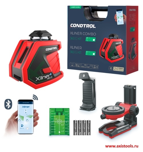- CONDTROL XLiner 360G Kit - это профессиональный расширенный комплект, включающий в себя лазерный нивелир XLiner 360G, настенное крепление Wall Mount pro, крепление-зажим, магнитную мишень, батарейки, руководство по эксплуатации и надежный пластиковый кейс.
