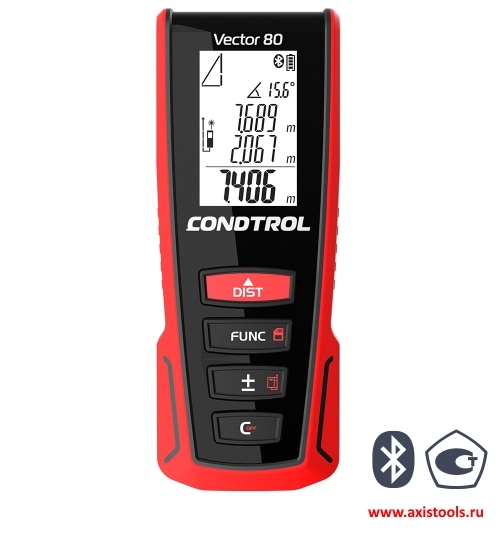 - CONDTROL Vector 80 – современный лазерный дальномер, предназначенный для быстрого и точного измерения расстояния до 80 м. Большой набор вычислительных функций, пылевлагозащищенный корпус, модуль Bluetooth позволяют использовать CONDTROL Vector 80 в профессиональной среде.