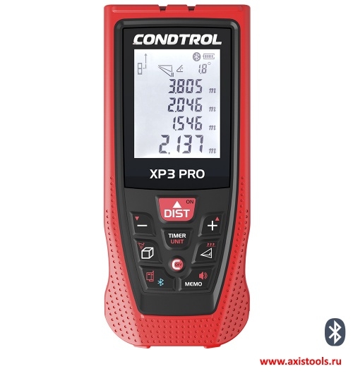 - CONDTROL XP3 Pro – профессиональный лазерный дальномер, предназначенный для работы как на улице, так и в помещении. В отличие от аналогов, лазерная рулетка CONDTROL XP3 Pro оснащена 3D акселерометром, что позволяет вычислять дистанцию между двумя произвольными точками в пространстве. Для комфортных измерений CONDTROL XP3 Pro имеет большой набор вычислительных функций, яркий дисплей и встроенный Bluetooth, с помощью которого можно работать с приложением CONDTROL Smart Measure.