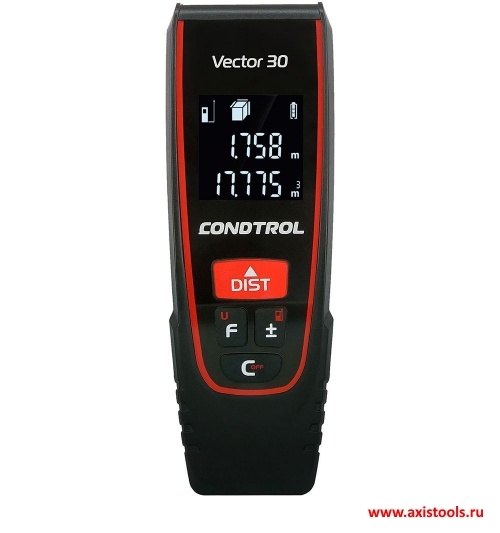 Оптимальный набор функций - дальномер CONDTROL Vector 30 позволяет проводить весь цикл измерений без помощи напарника. Прибор выполняет автоматические вычисления площади, объёма помещения, позволяет складывать и вычитать полученные значения. Функция косвенных вычислений по теореме Пифагора позволит выполнять замеры в труднодоступных местах.