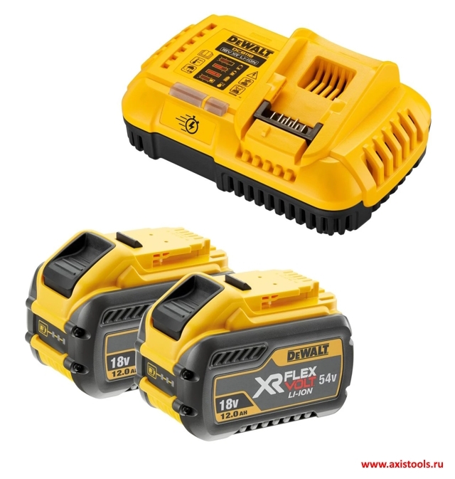 Универсальный энергокомплект DEWALT: две батареи, способные работать в режимах 18 В и 54 В, полностью совместимые со всеми инструментами линеек XR и FLEXVOLT, и зарядное устройство с системой интеллектуальной зарядки и встроенным вентилятором.